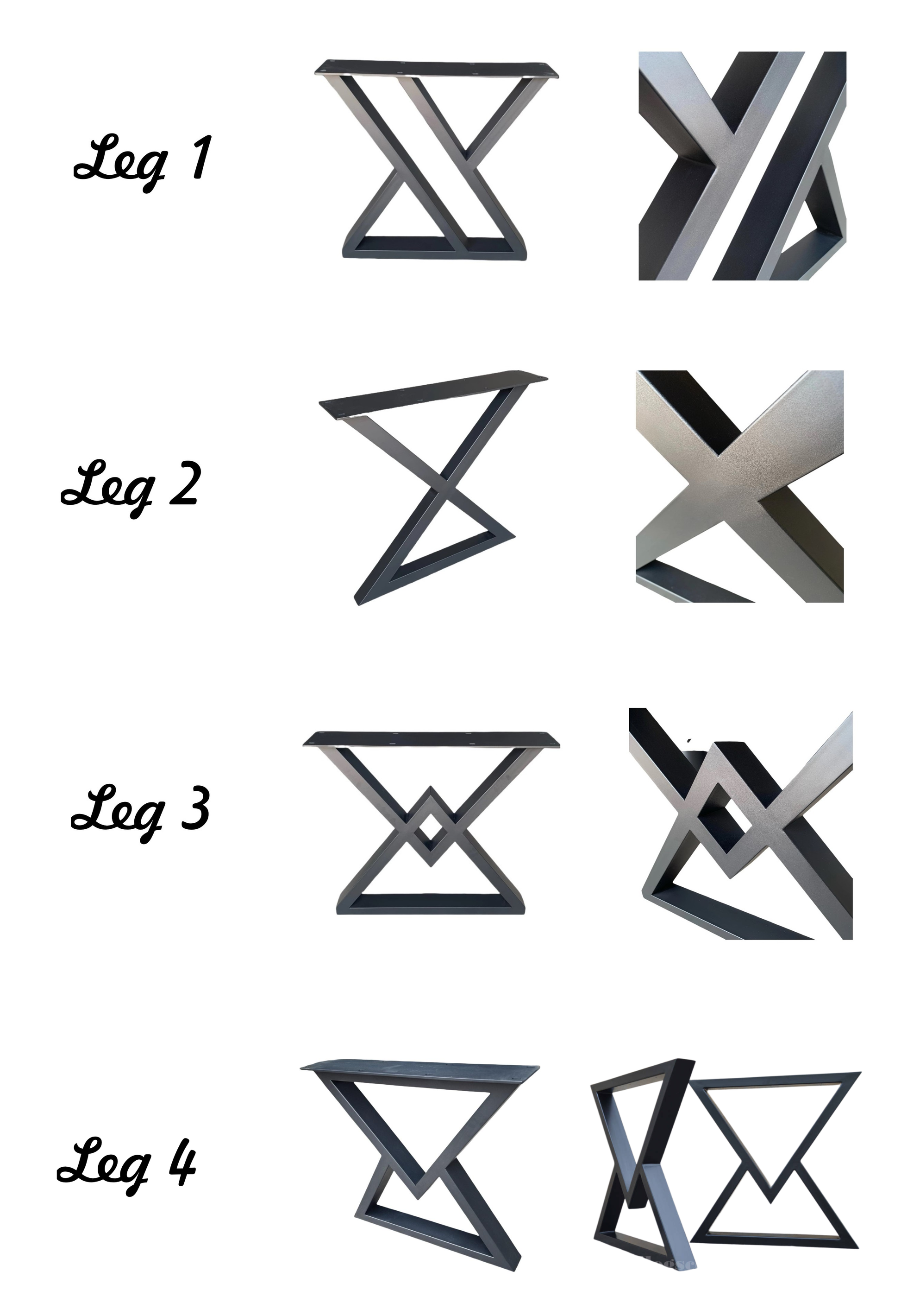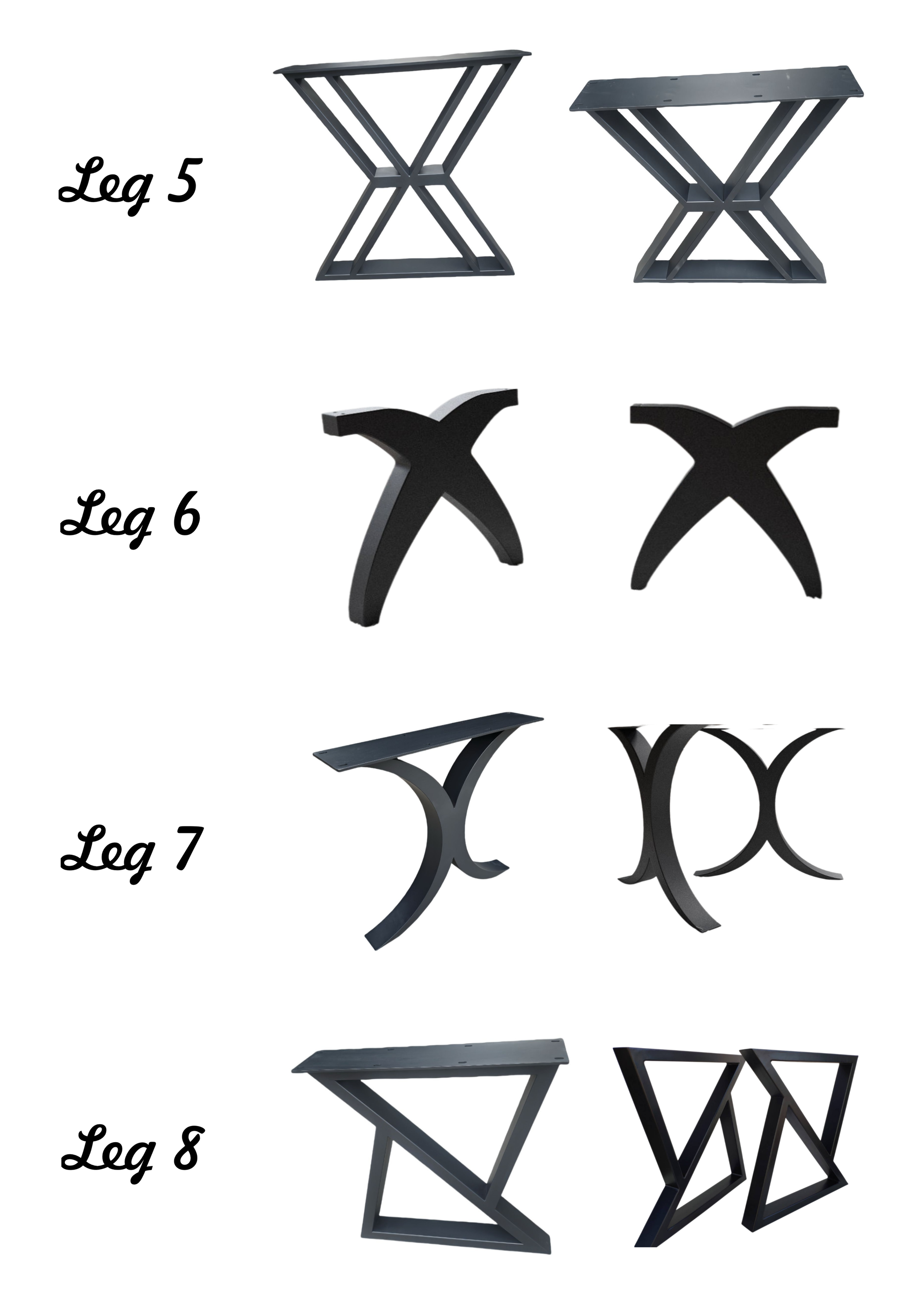 We have 8 different leg designs for you to choose from. All the legs provided are solid metal pipe legs which are strong and sturdy. They are connected to the underneath of the table via screws and bolts which are screwed on using an alan key, which is provided. Typically the legs can be mounted within five minutes.